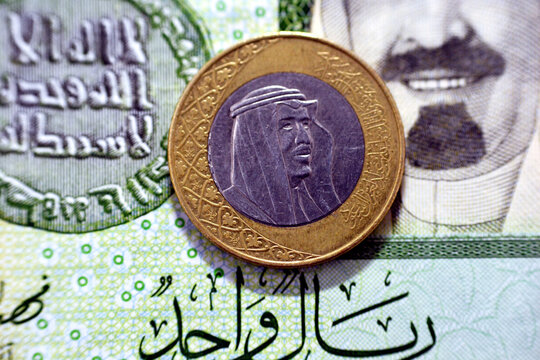 One Saudi Arabia riyal coin (obverse side) year 2016 on 1 Saudi riyal paper banknote background, one metal and banknote Saudi riyals together, 1 Saudi riyal coin with the slogan of king Salman