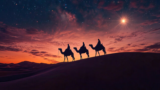 Traditional Christian Christmas Nativity Scene of baby Jesus in the manger with Mary and Joseph in silhouette and wise men