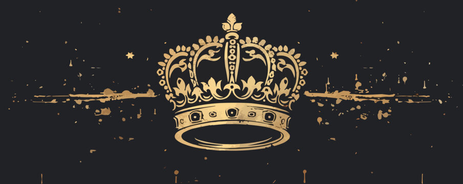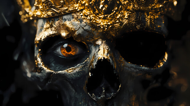 A close-up of a human skull wearing a golden crown. the skull has one eye and is covered in gold paint. it is set against a dark background. Gilded Skeleton Kings. Illustration