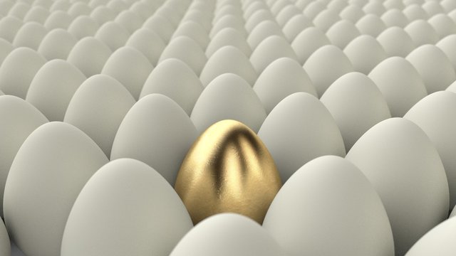 Close up of a golden egg among regular eggs. 3D render with nice depth of field.