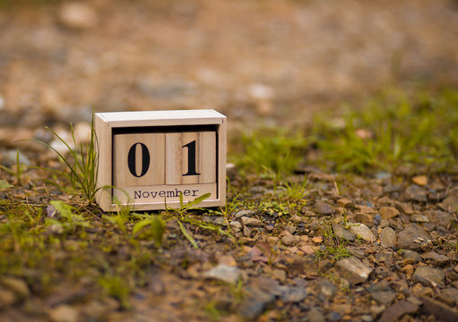 November 1st. Day 1 of November set on wooden calendar on wooden plank background. Autumn time
