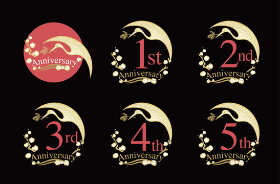 イラスト素材:1 -5th和風アニバーサリーお祝いロゴ、松喰鶴、anniversary emblem with Japanese style