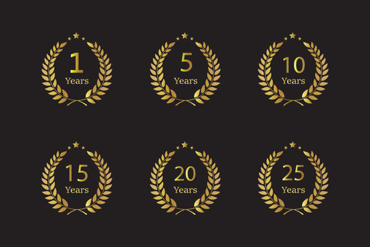 Anniversary icon or logo set with laurel wreath. 1, 5, 10, 15, 20, 25 years jubilee, birthday golden badge, label or emblem. Celebration design element. Anniversary icon on black background.