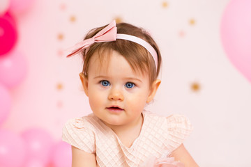 Portrait of cute baby girl wearing birthday hat, one year old birthday celebration .