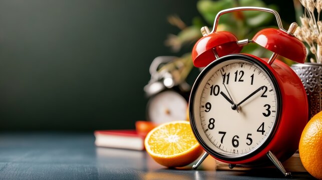 Red alarm clock with the time of 10:30 on it sits on a table with a book and an orange