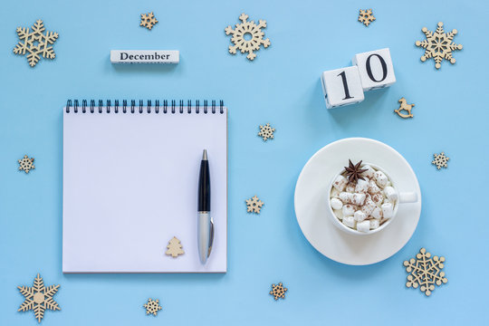 calendar December 10 cup cocoa and marshmallow, empty open notepad