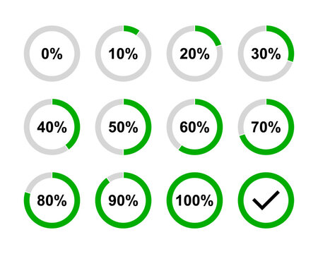Percentage circle set. Loading indicator set. Circle loading or circle progress with percentage collection.  Set of circle percentage diagrams for infographics 10 20 30 40 50 60 70 80 90 100 percent.