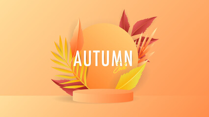 Autumn seasonal background with podium display minimum and autumn leaves on orange background , illustration 3D Vector EPS 10