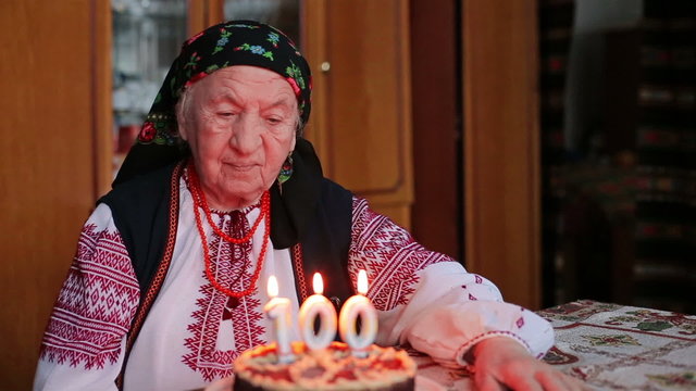 Centenarian celebration: elderly woman with birthday cake marking 100 years