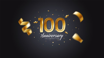 100th anniversary celebration Gold numbers with dotted halftone, shadow and sparkling confetti. modern elegant design with black background. for wedding party event decoration. Editable vector EPS 10