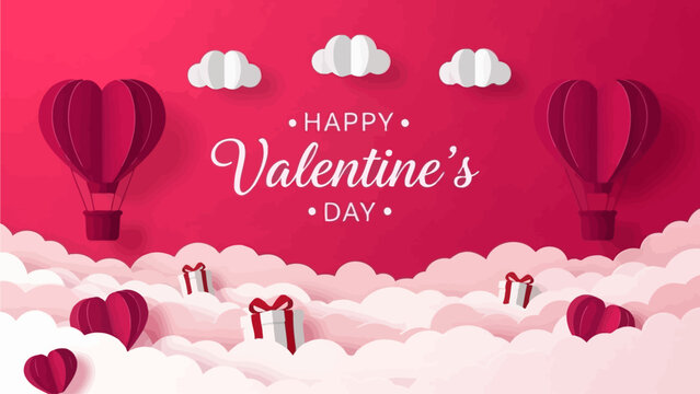 Romantic Valentine's Day celebration in a beautiful paper art style, featuring festive heart balloons, dreamy clouds, and charming gift boxes for your loved ones