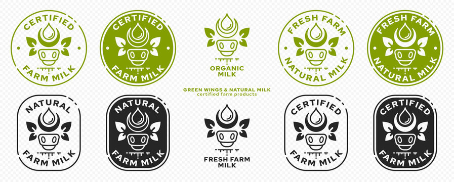 Concept for product packaging. Labeling - natural farm milk. Cow icon with milk drop and leaf-ears or leaf-wings - a symbol of a natural ingredient. Natural organic products symbol. Vector set.