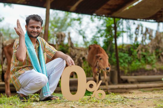 Banking or financial concept : Young indian farmer showing zero percent symbol at his cattle farm