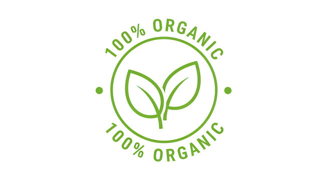 100% natural organic product vector label with abstract green leaf for healthy food, vegan, icon, logo, label, seal, tag, sign, seal, symbol, badge, stamp, sticker, emblem, banner. Isolated on white