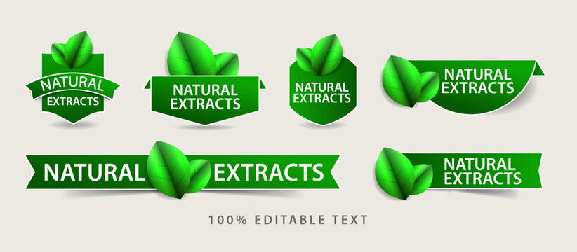 Natural Extracts label sticker badge Vector Set with green leaf. Editable Text EPS file