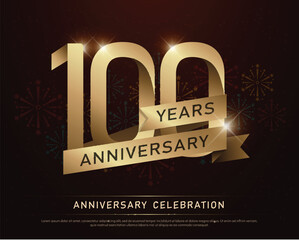 100th years anniversary celebration gold number and golden ribbons with fireworks on dark background. vector illustration