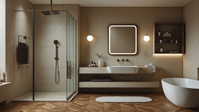 Expansive shower area, standalone faucet, square mirror, vanity shelf, sink, dual lights, and an oval white porcelain bathtub characterize the beige bathroom with parquet flooring. A design for a m...