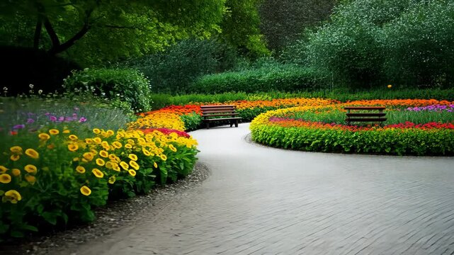 A stone garden path with turquoise pots of pink flowers leading to a cozy seating area, bathed in warm sunlight, capturing a relaxing garden retreat.