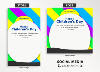 World Children's Day social media post and story template, crop and use, social media content and feed, 20 November Children Day, easy use template, content design with colorful background