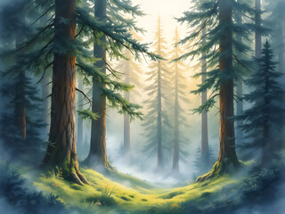 A vibrant watercolor illustration of a thick, healthy pine forest, contrasting sharply with the previous image (1096). Tall evergreen trees stand brightly illuminated by direct sunlight,
