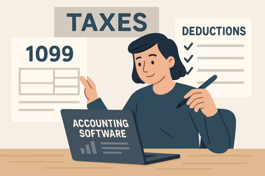 Tax Management Essentials. Banner showing freelancer managing taxes with 1099 forms, deductions list, and accounting software.