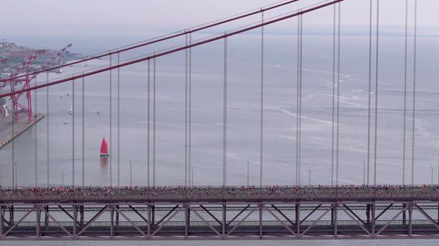 Side-on aerial drone shot of half marathon and 10K long-distance running event in Lisbon, Portugal, Europe. Runners crossing the iconic famous red 25th April suspension bridge