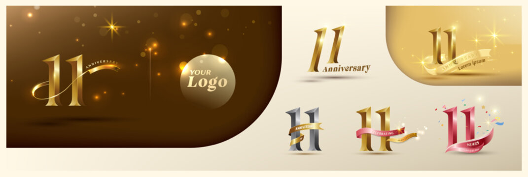 11th anniversary logotype modern gold number with shiny ribbon. alternative logo number Golden anniversary celebration