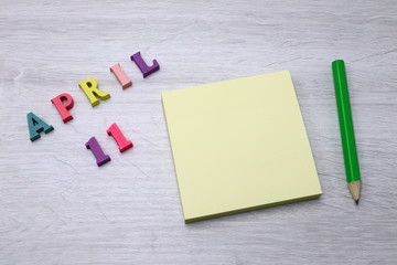 April 11 - Daily colorful Calendar with Block Notes and Pencil on wood table background, empty space for your text or design