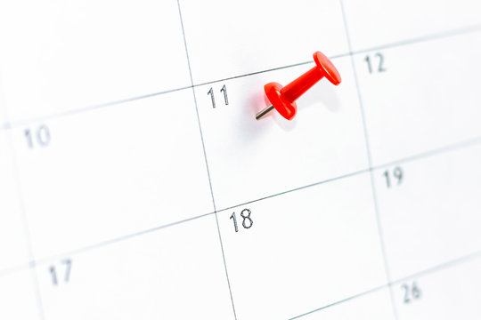 11 date pinning on calendar with Red color pin thumbtack. Save the Date. concept organization of working time