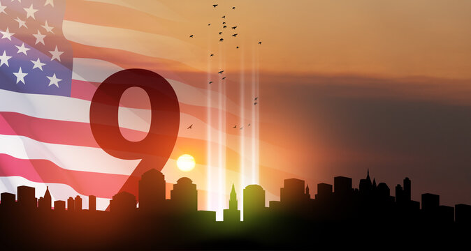 Patriot day tribute with twin towers silhouette and memorial text