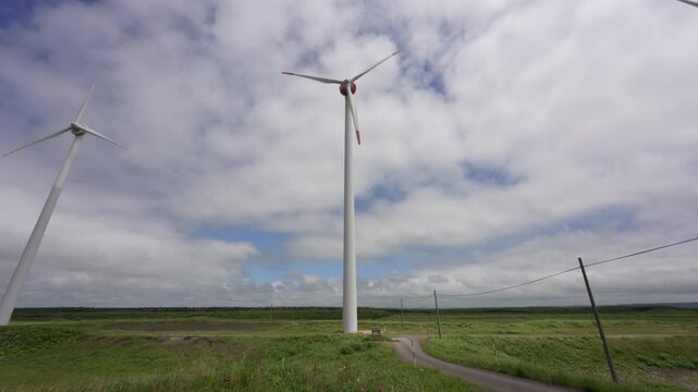 Hokkaido,Japan - July 11, 2024: Wind power generations along  Sea of Japan in Hokkaido, Japan