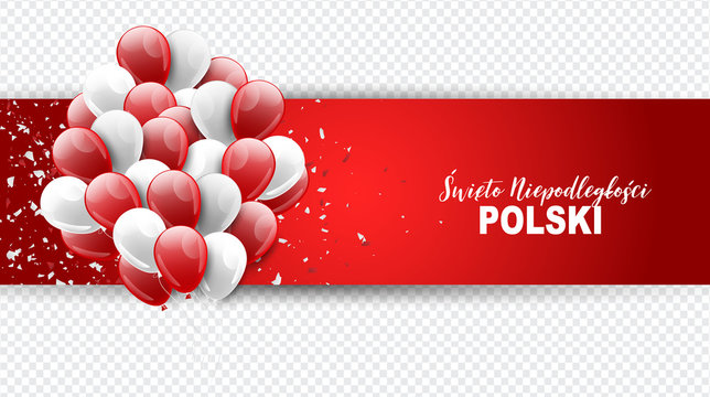 Święto Niepodległości Polski 11 listopada (in Polish) - Poland Independence Day 11 November. Holiday celebration banner, poster or flyer. Red and white national flag color balloons