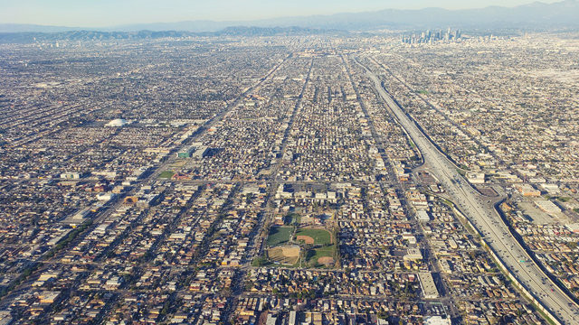 daytime Aerial view of the 110 freeway in Los Angeles, California, USA.