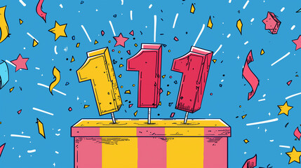 Colorful celebration podium with 111 number candles and confetti.