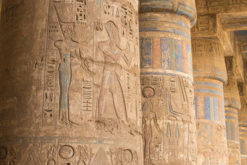 Egypt, Luxor, West Bank, The temple of Ramesses 111 at Medinet Habu, Columns in the portico of the second court