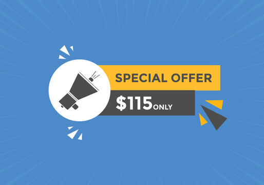 $115 USD Dollar Month sale promotion Banner. Special offer, 115 dollar month price tag, shop now button. Business or shopping promotion marketing concept
