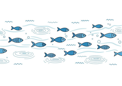 Seamless pattern with cute blue fish swimming in the water with ripples, hand drawn illustration, simple design, 118 chars