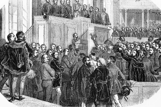 The Hungarian National Assembly. 11th July 1848. Antique illustration. 1856.
