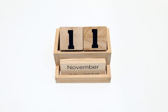 11th of November wooden perpetual calendar. Shot close up isolated on a white background