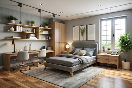 This modern bedroom's 11x11 square footage is perfectly proportional to its contemporary furniture, showcasing a bed,