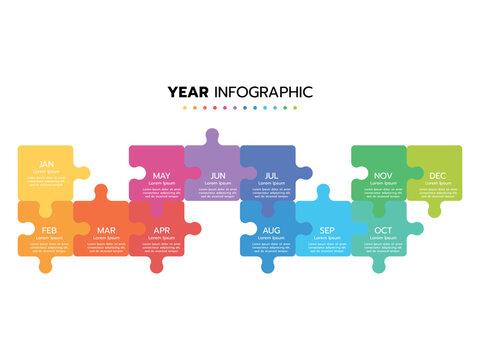 Infographic template for business. Concept with 12 pieces of a puzzle or 12 months, 4 quarter steps vector infographic.