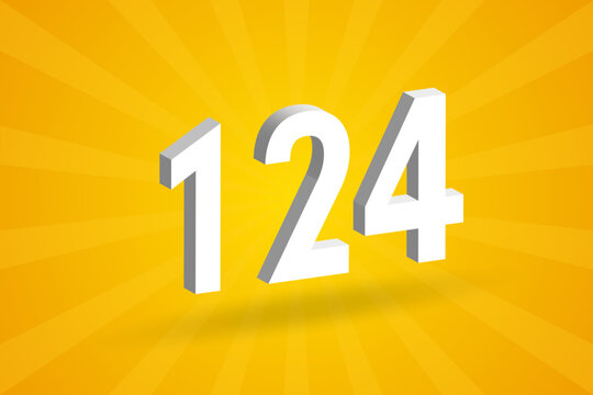 3D 124 number font alphabet. White 3D Number 124 with yellow background