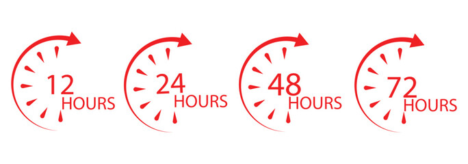 12 hours service icon vector set. Red 12h duration sign. Red 12 hours clock arrow icons, work and delivery time symbols. Red 12hr support sign collection. 12 hours icon vector set.