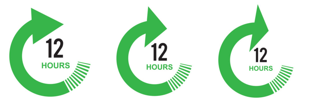 12 hours service icon vector set. 12 hours service duration sign. 12 hours clock arrow icons, work and delivery time symbols.  12hr support sign collection. hours clock arrow on white background.