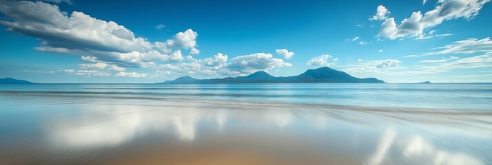 Serene beach with a glossy shoreline, clear skies, and mountains afar, symbolizing relaxation, freedom, and natural beauty.