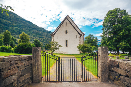 Old white church in Norway at sunny summer day