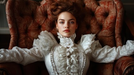 A woman in an intricately designed vintage white lace dress reclines in an antique, plush armchair, exuding elegance, luxury, and timeless beauty of a bygone era.