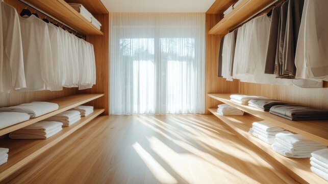 This image features a wardrobe neatly arranged with white garments and towels, bathed in gentle natural light, evoking a sense of order, freshness, and simplicity.