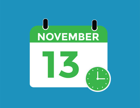 13 November, calendar date icon. 13 November Calendar Date for Deadlines or Appointment. Day, month. vector illustration.