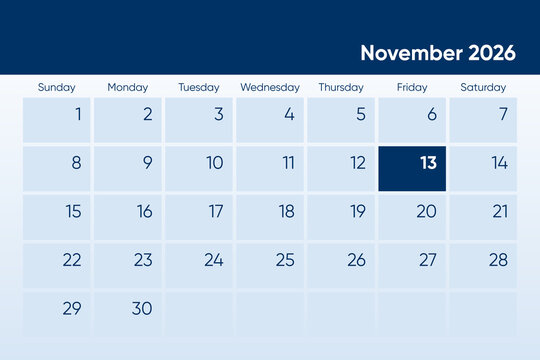 13 November 2026 calendar day design. It shows 2026 November 13 date calendar page